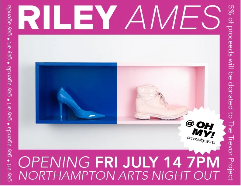Riley Ames is a trans nonbinary mixed-media artist who uses the aesthetics of pop culture, fashion, and ready-made objects to drive discussion about sex, gender, and identity. Their work is informed by academic research and executed with a wry sense of humor.